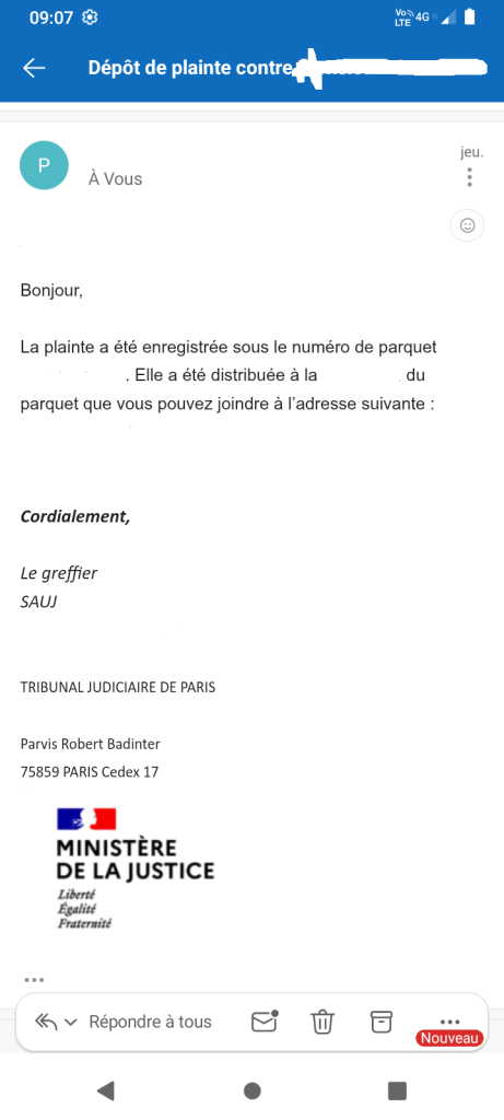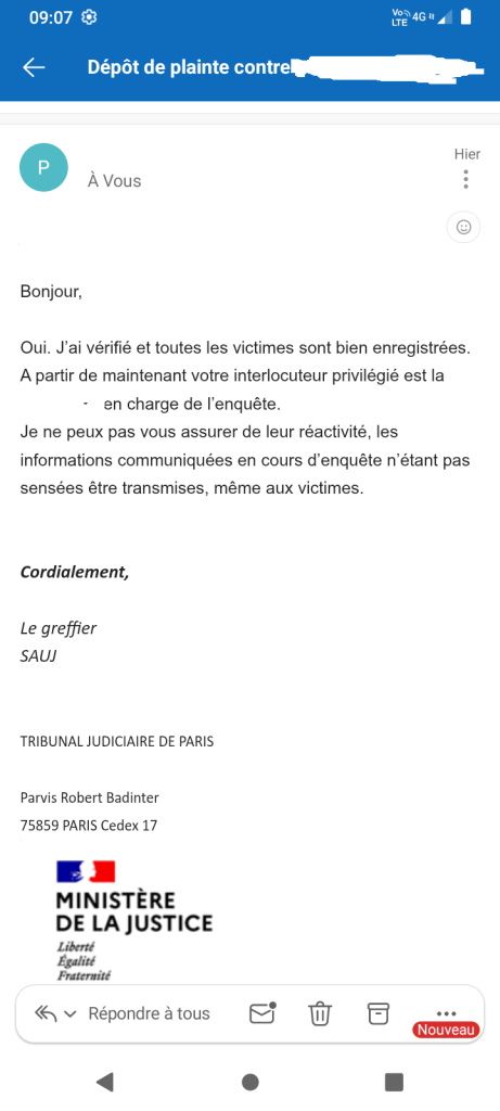 Au tribunal, vous pouvez déposer des plaintes auprès du procureur de la République, sans réponse (2 à 3 mois), vous pouvez écrire au président du tribunal, sans réponse (2 à 3 mois), je sais c’est long, vous pouvez écrire au Conseil supérieur de la magistrature au 21, Bd Haussmann 75009 Paris. Le conseil enregistre les manquements des juges.